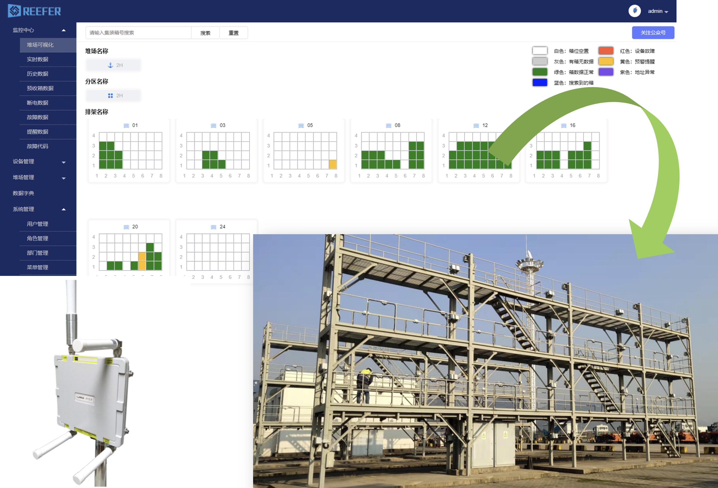 Through reefer data collection devices, network transmission and software management system, we achieve temperature data collection, reefer abnormality alarms, effectively improving real-time control and early warning for all reefers in yards and vessels. Install remote inspection devices in reefer storage areas to collect container number, status, set temperature, supply/return air temperature, humidity, voltage, current, alarm codes and more. The port terminal monitoring center displays real-time reefer temperature/humidity/current/voltage data, visualizes reefer slot maps, and supports remote temperature setting and inspection management.